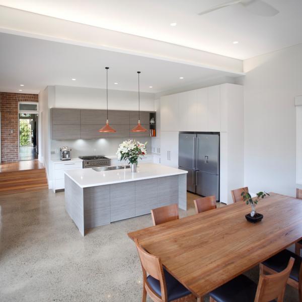 Shape : L shaped mid-size flat-panel white and light grey wood veneer kitchen cabinet with island